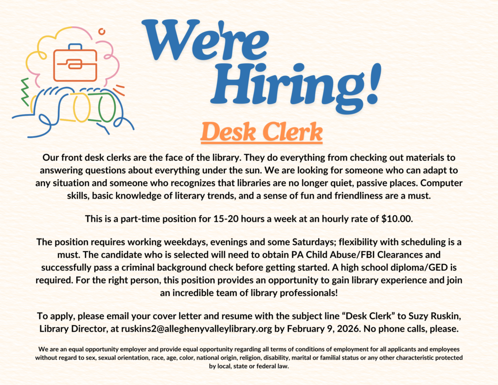 Community Library of Allegheny Valley strengthens the community by inspiring ideas, enriching lives and encouraging lifelong learning.